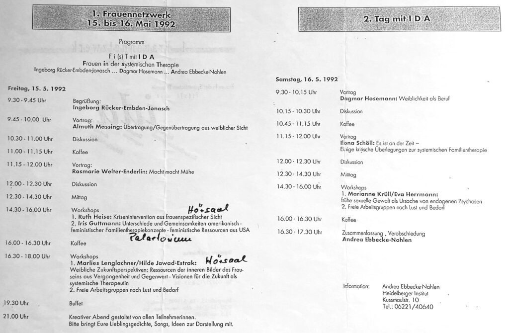 Ich war 1992 beim ersten beeindruckenden und kreativen IDA-Kongress „Frauen in der systemischen Therapie“ dabei. Die Dokumentationen waren noch ausschließlich analog. Gerne teile ich hier mit euch das Programm des ersten Kongresses im Mai 1992.